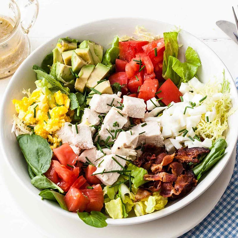 Lettuce, green olives, cucumber, onion, egg, chicken, bacon, tomatoes, blue cheese, crumbles